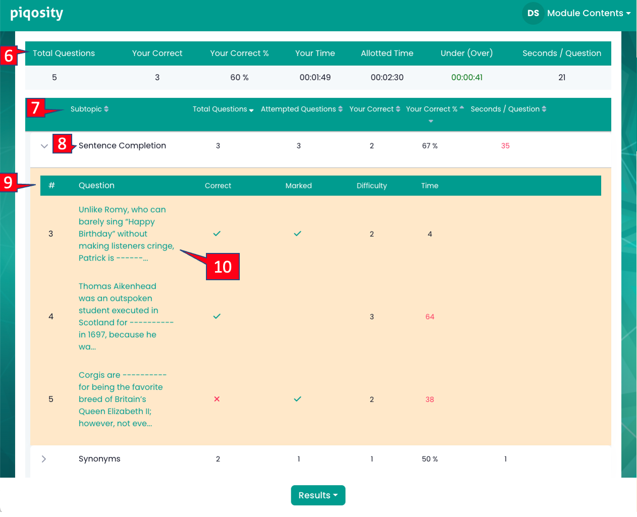 After taking a quiz or full-length test, Piqosity will score your exam and present you with a range of information: