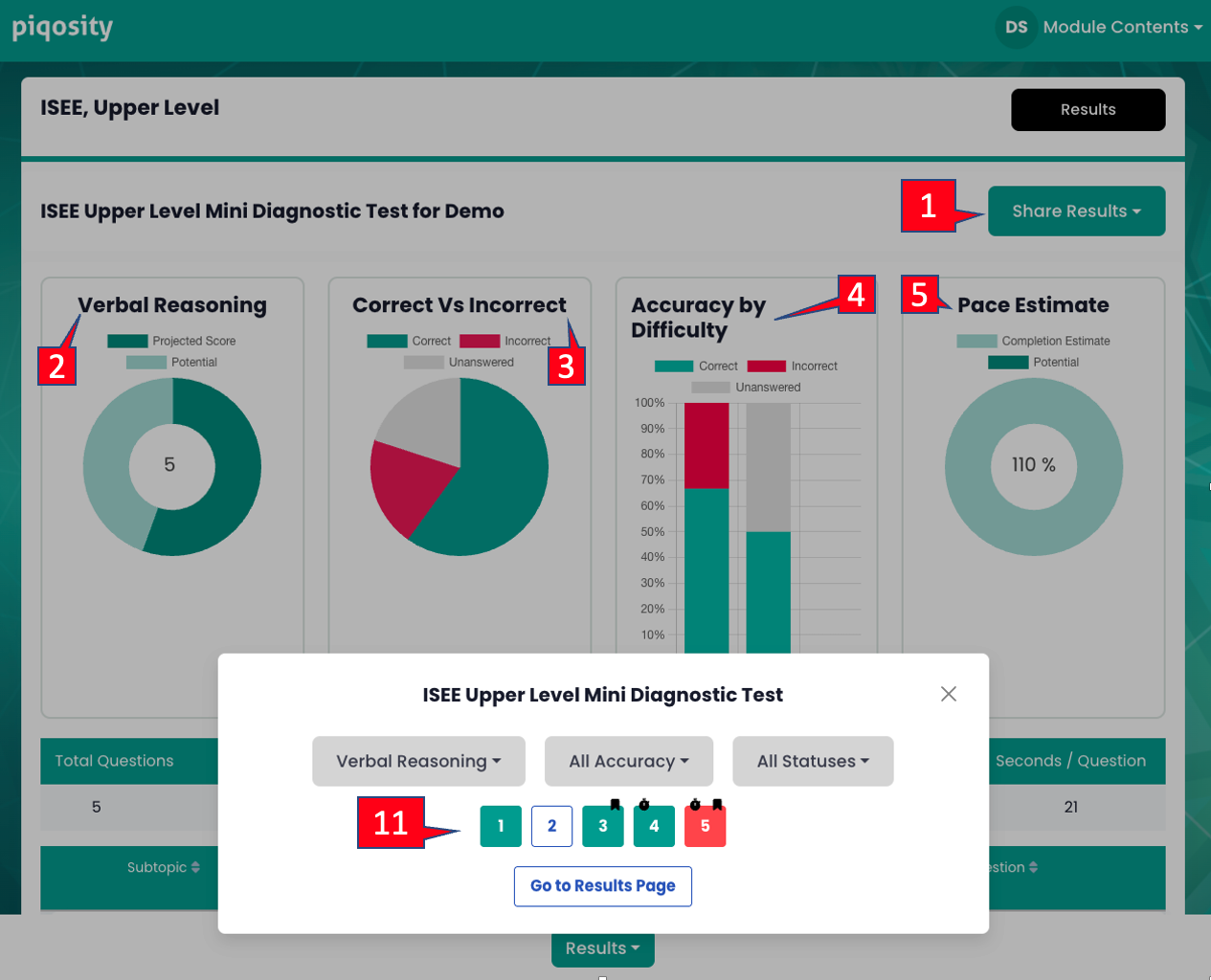 - Share Results generates a sharable link that allows others to see your results without being logged into Piqosity.